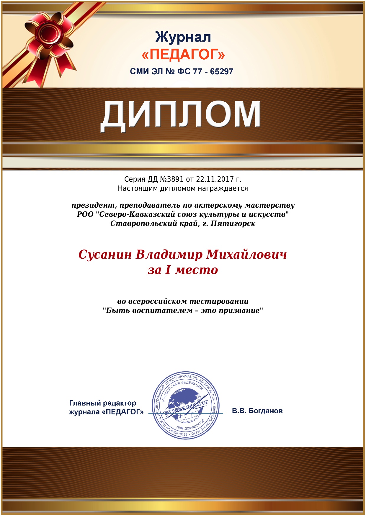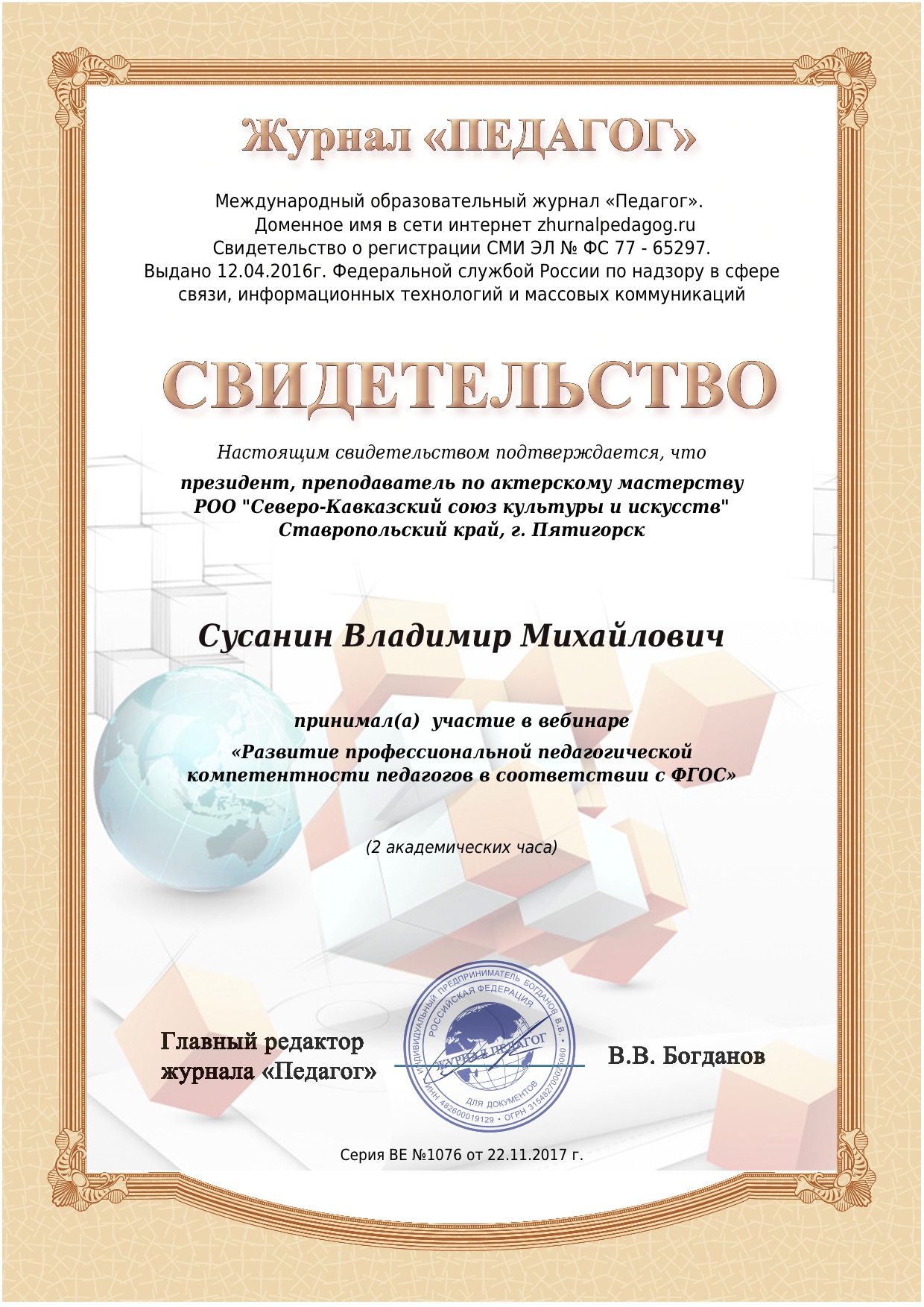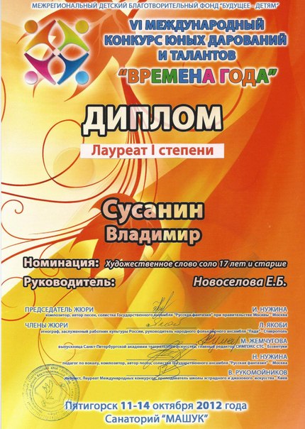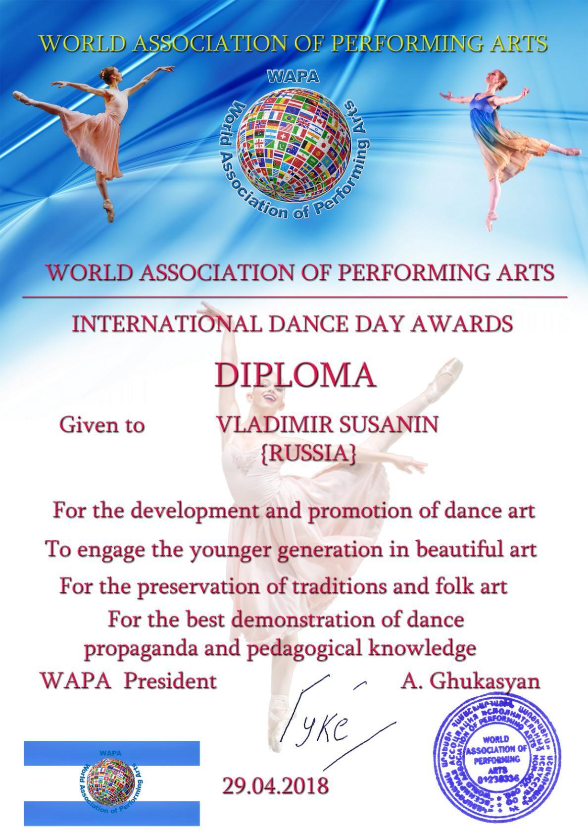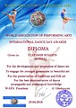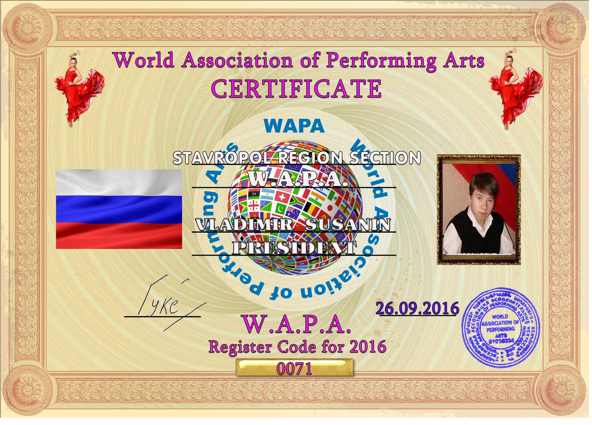 - Сертификат № 0071 - уполномоченного при президенте всемирной ассоциации исполнительских искусств по Ставропольскому краю.