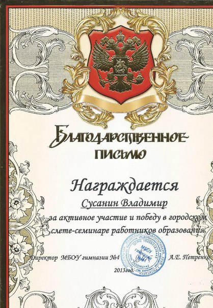 - Благодарственное письмо за активное участие и победу в городском слете-семинаре работников образования.