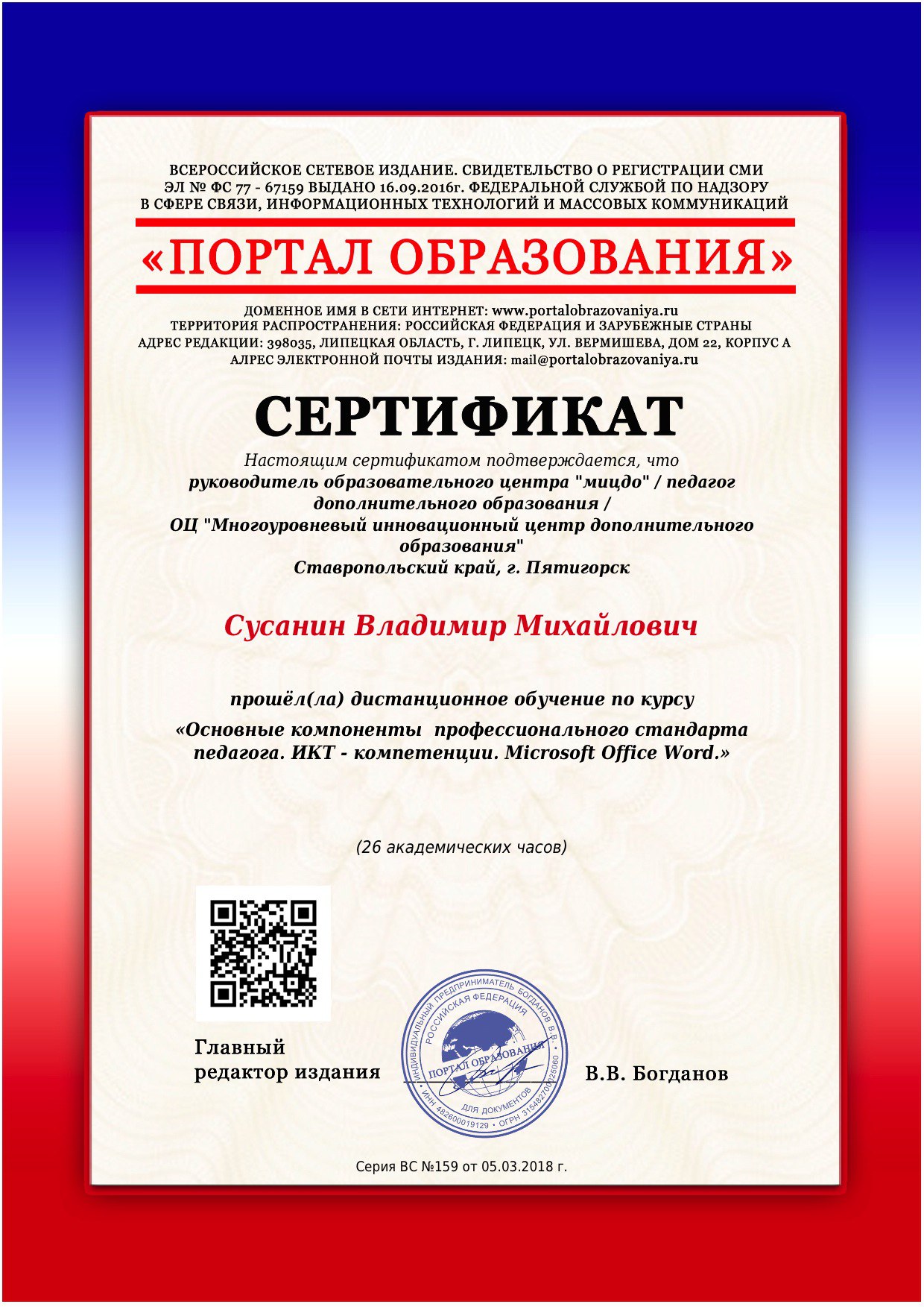 В 2018 г. прошел профессиональную переподготовку в Волгоградской гуманитарной Академии по специальности преподаватель по эстрадному вокалу.